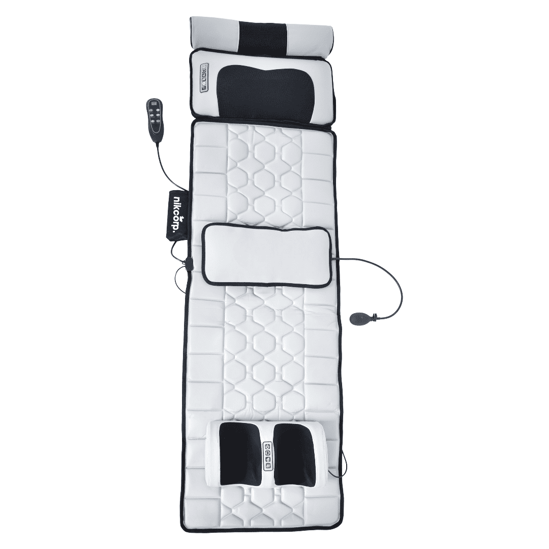 Masažna podloga Nikcorp s funkcijo ogrevanja: sprostite se in razgibajte svoje telo z masažno podlogo Nikcorp s funkcijo ogrevanja. Opremljena je z 10 vibracijskimi motorji in zagotavlja masažo celotnega telesa, ki zajema hrbet, pas, boke, stegna in teleta. Poleg tega simulirana masaža z gnetenjem deluje na vrat in stopala ter zagotavlja globoko sprostitev mišic.