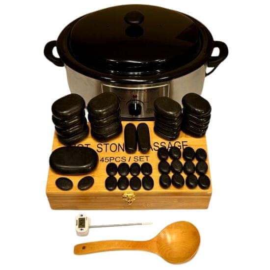 Vroči kamni HOT Stone Set 45 vključuje 6 litrski profesionalni, električni grelec, 45 ročno poliranih, brušenih, pravilno oblikovanih kamnov in leseno žlico. Pravilna oblika vročih kamnov brez neprijetnih grbinic ali robov zagotavlja optimalno prilagajanje posameznim delom telesa. Celoten opis