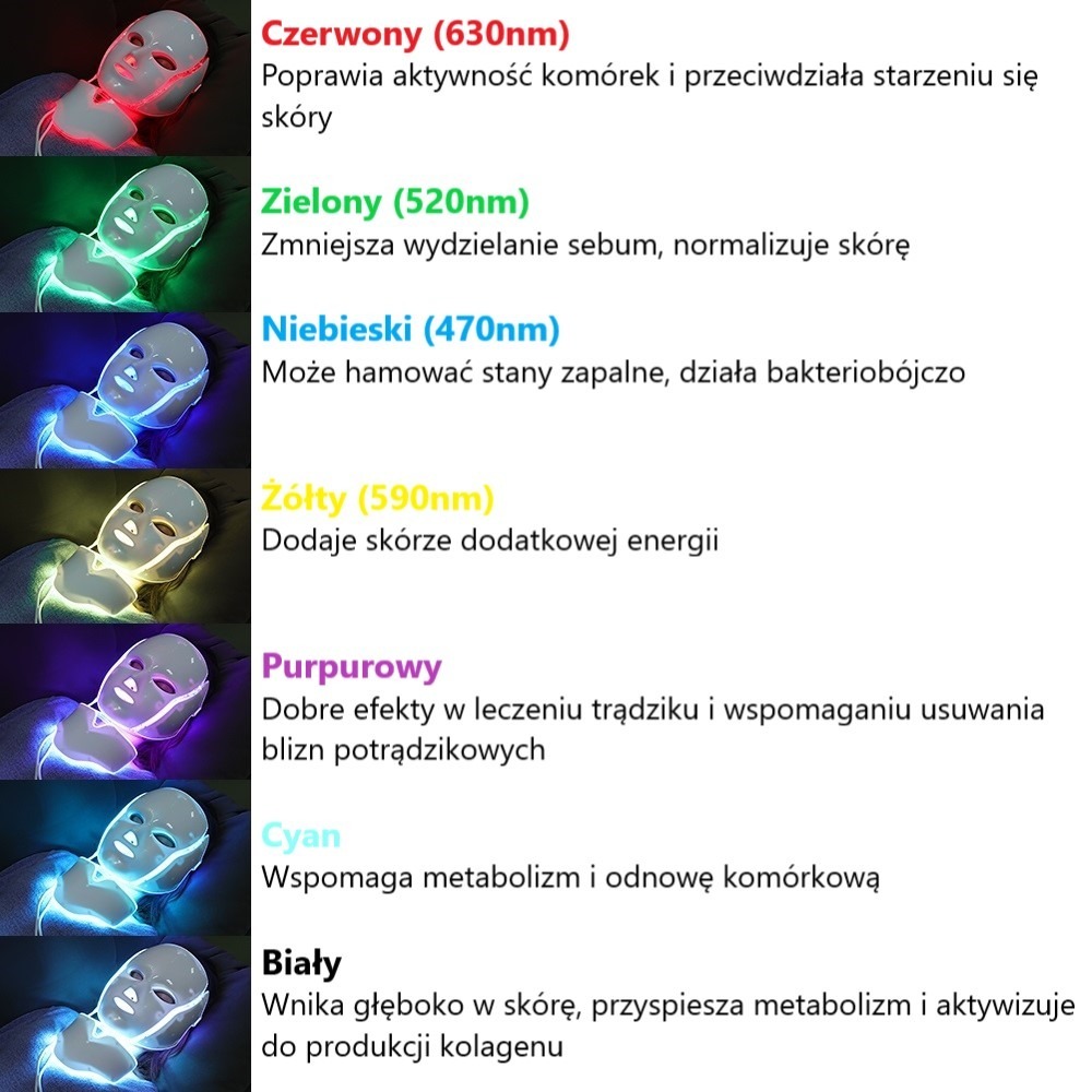 Rdeča svetloba – spodbuja kožo k povečanju proizvodnje kolagena in elastina, kar pomaga zmanjšati gube in izboljšati čvrstost kože. Ima protivnetne učinke in zmanjšuje rdečico.