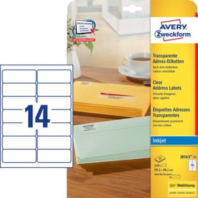 Transparentne etikete Avery Zweckform J8563–25 so primerne za tiskanje z InkJet tiskalniki. So bele barve in v velikosti 99,1 × 38,1 mm. Celoten opis