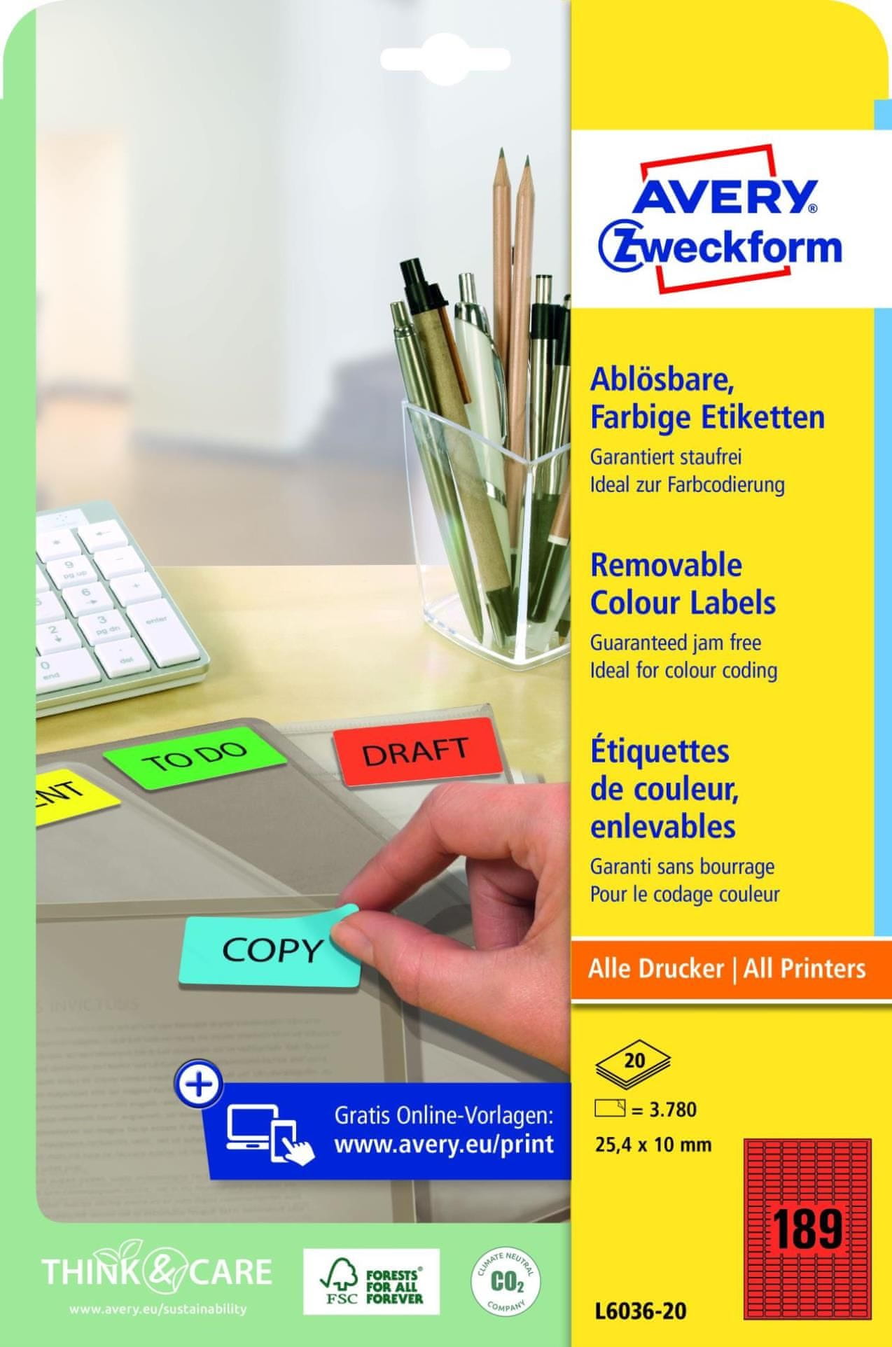 • Snemljive rdeče etikete Avery Zweckform – idealne za barvno kodirane dokumente in mape