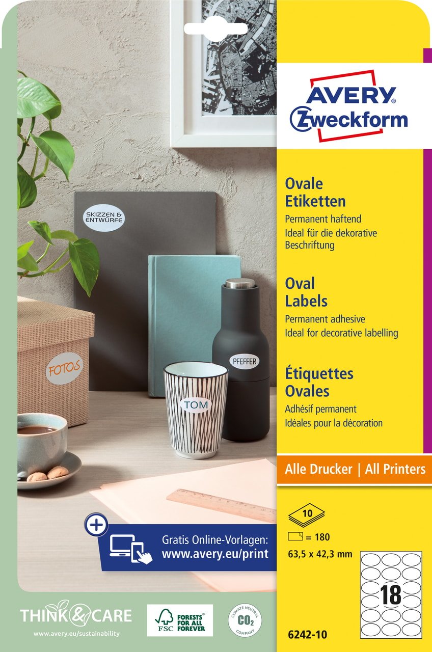 Avery Zweckform ovalne etikete 6242–10 imajo permanentno lepilo, ki ima dober oprijem na raznih podlagah. Velikost etiket je 63.5 × 42.3 mm. Zaradi posebne oblike so te nalepke primerne za opazno in elegantno označevanje raznih predmetov in embalaže. V zavitku je 180 etiket. Potiskate jih lahko z vsemi standardnimi tiskalniki. Za oblikovanje etiket priporočamo uporabo brezplačnega programa Avery Design & Print.