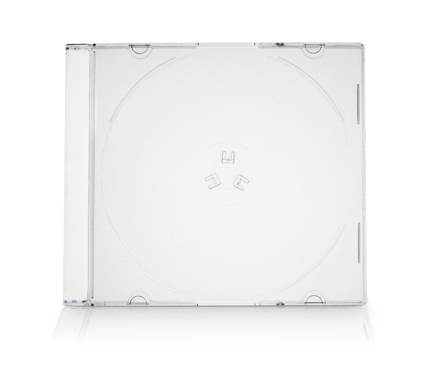Plastična prozorna škatla za CD-je, ki omogoča varno shranjevanje optičnih medijev.