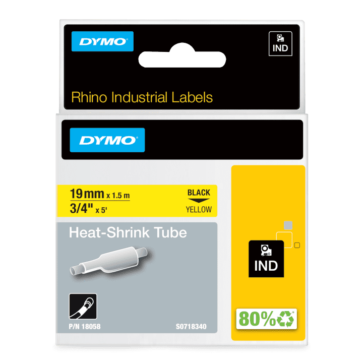 Dymo 18058 je profesionalna termo skrčljiva cevka iz linije RHINO, izdelana za trajno in varno označevanje kablov in žic. Natis se nanese pred nanosom cevke, nato pa se ta s toploto skrči okoli kabla, kar omogoča trajen in zaščiten zapis.