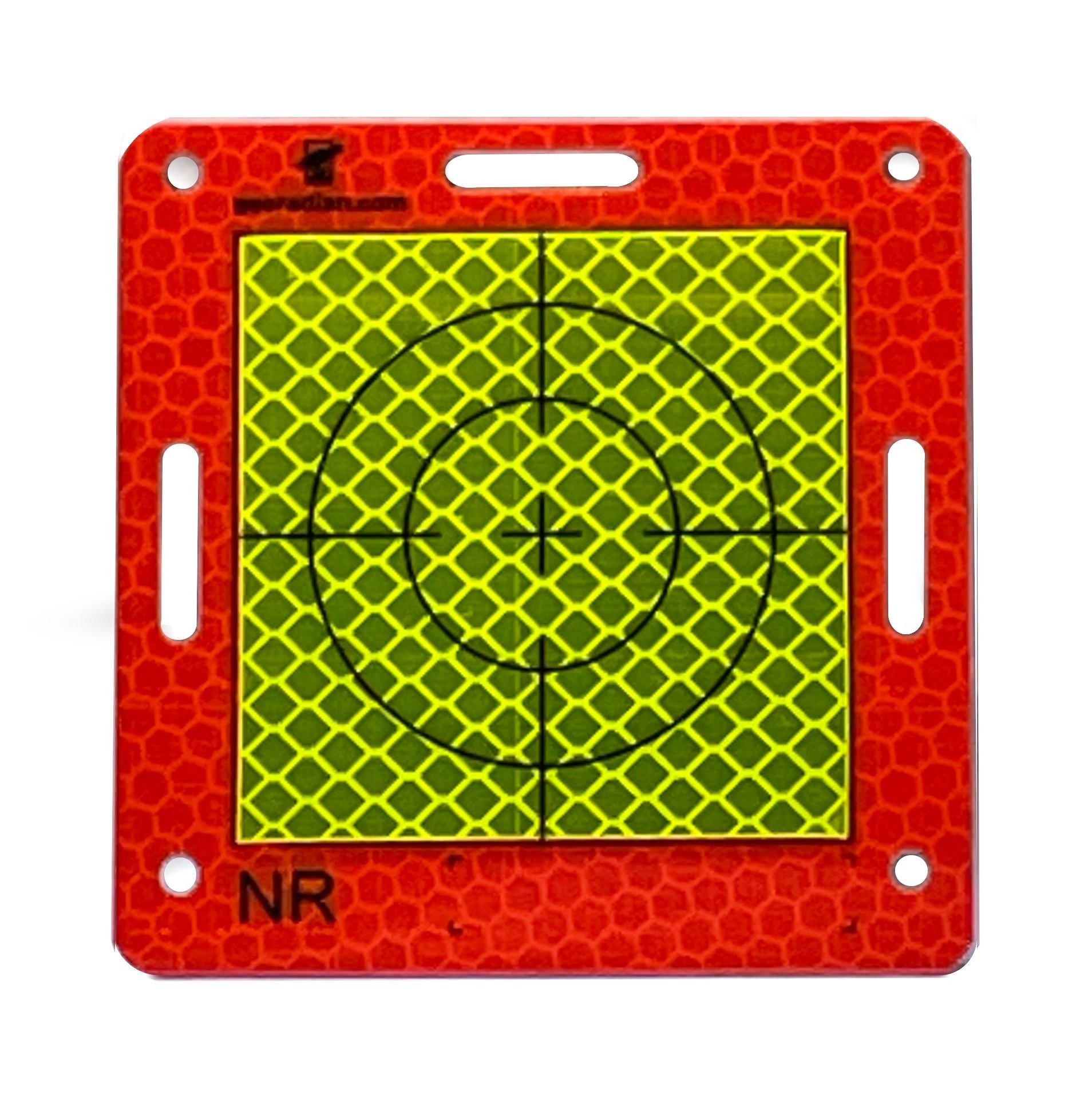 Tarča daljinomera (60×60 mm), prilepljena na aluminijasto ploščo (85×85 mm), za večkratno uporabo.