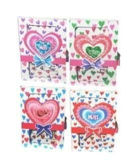 Barvit dnevnik s trdimi platnicami, motivom srca in ključavnico za zapisovanje vseh vaših najglobljih skrivnosti. Na voljo v več barvah, izbranih naključno. Cena je na kos.