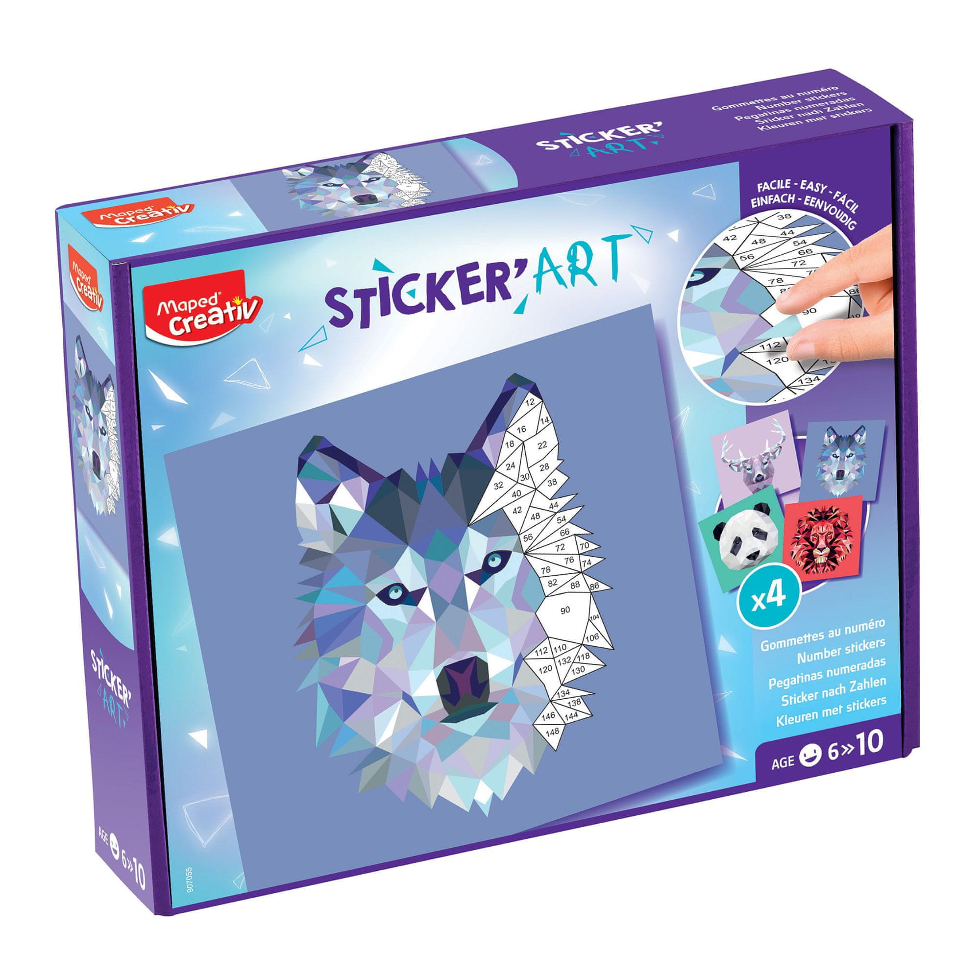 Origami set za izdelavo 4 slik živali: volk, panda, jelen in lev. Komplet vsebuje 400 nalepk za izdelavo 4 kartic (višina približno 20 cm). Vsaka slika na kartici je sestavljena iz številk in vsaka nalepka ima svojo številko. Otrok s pomočjo številk na karticah in nalepkah ustvari svojo kreacijo. Slike se razlikujejo po težavnostnih stopnjah.