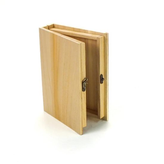 Lesena škatla v obliki knjige je izvirna in dekorativna rešitev za shranjevanje drobnih predmetov. S svojim videzom spominja na pravo knjigo, zato se lepo poda na polico med knjige ali kot samostojen dekorativni element.