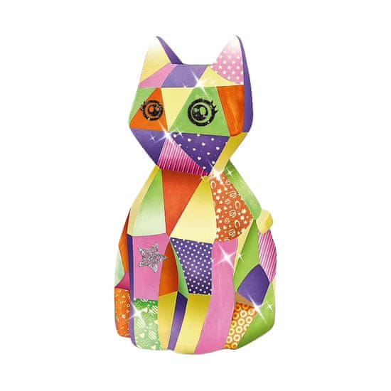 Set vsebuje: belo plastično mačko za razstavo, skupaj z barvami, čopičem in pisanimi nalepkami.