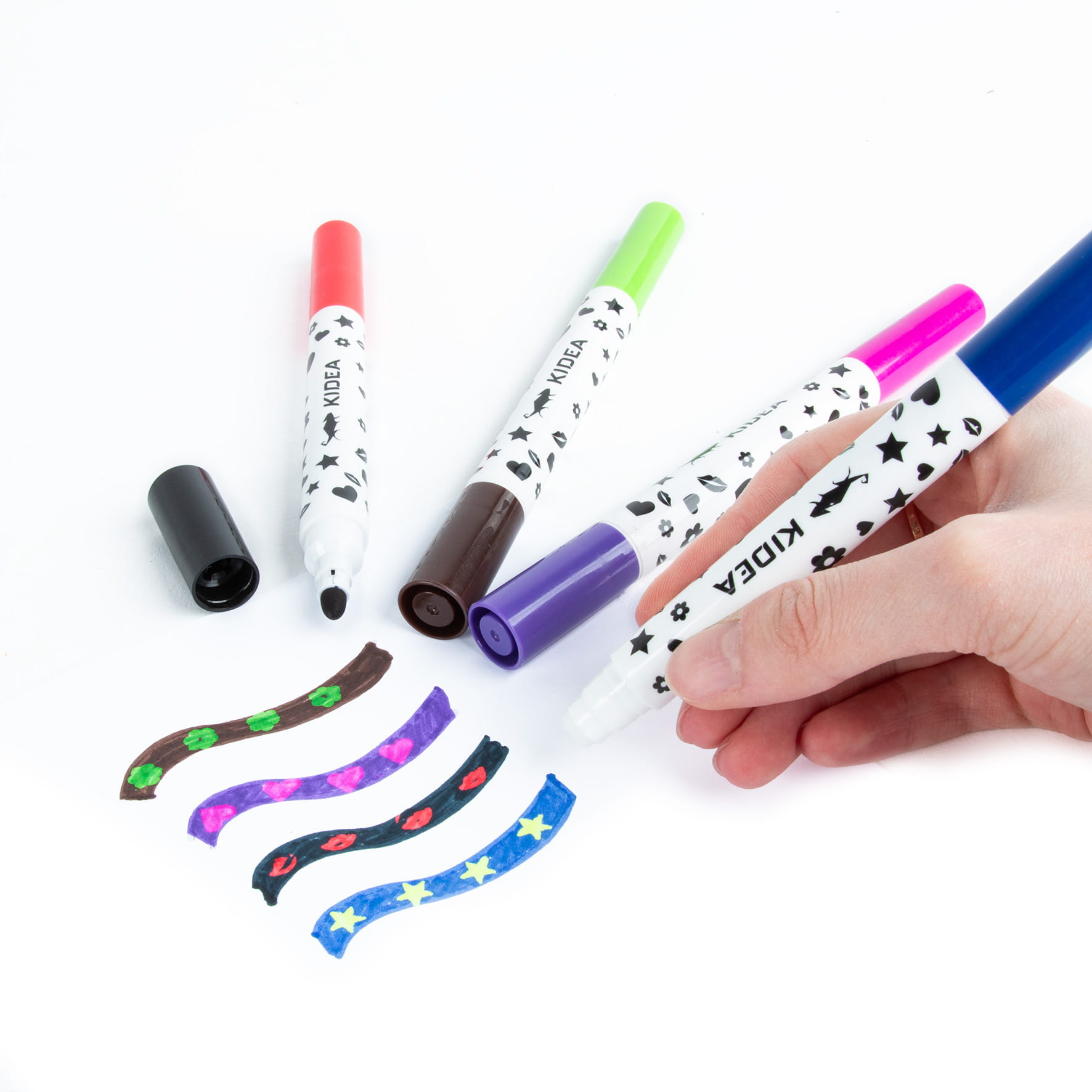 Vsak flomaster ima dve praktični konici: eno s klasičnim flomastrom in drugo z žigom, ki ga je mogoče nanesti čez barvni flomaster.