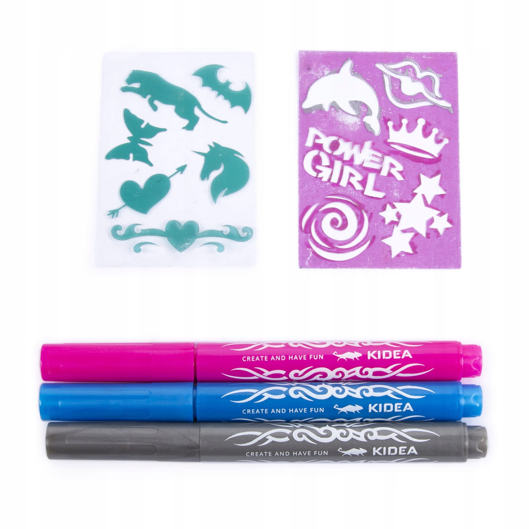 12 šablon vam bo pomagalo ustvariti zanimive dizajne. Kovinski flomastri v roza, modri in sivi barvi. Popolni kot darilo. Za odstranitev tetovaže uporabite odstranjevalec ličil.