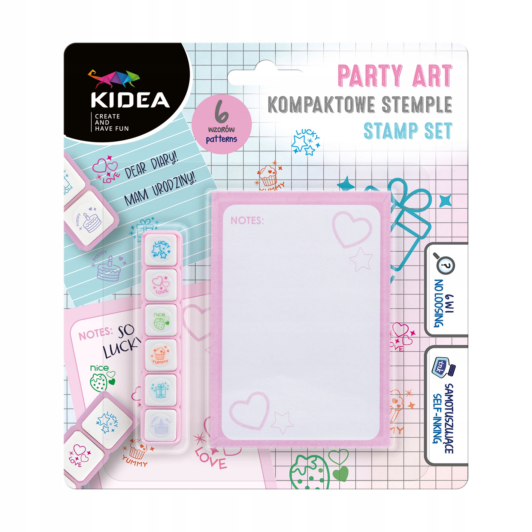Ta komplet kompaktnih, samočrnilnih štampiljk s 6 dizajni na temo zabave je odličen način za ustvarjalnost in personalizacijo vabil, rojstnodnevnih voščilnic, risb in še več! Samo kliknite na izbrano sliko, da ustvarite jasen in čudovit štampiljko. Štampiljke so v pametni embalaži, da se ne bodo izgubile v peresnici, priloženi zvezek pa ponuja priročen prostor za preizkušanje novih dizajnov.