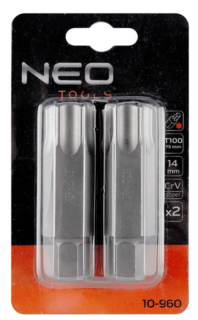 TORX nastavek, velikost T100, dolžina 75 mm. Izdelan iz visokokakovostnega legiranega jekla S2. 25-letna garancija proizvajalca potrjuje visoko kakovost orodja. Blagovna znamka NEO izpolnjuje pričakovanja profesionalcev.