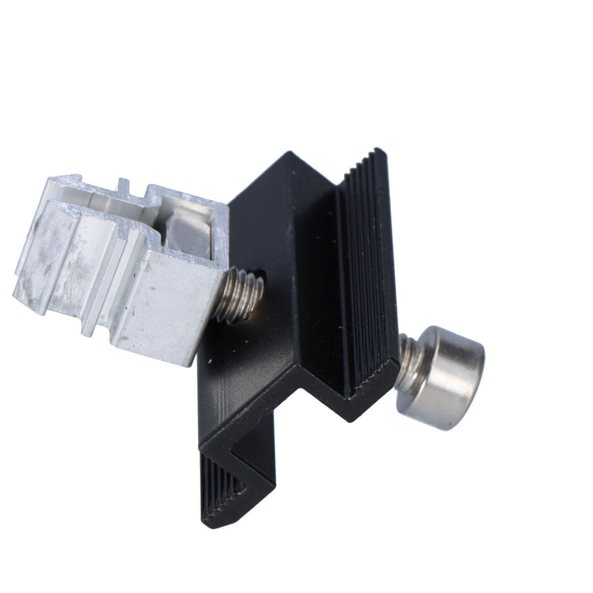 Montaža PV panelov na aluminijaste profile, aluminijaste montažne letve in nosilce UPDMC in UPG…MC Komplet vključuje objemko, imbus vijak SAM8…, kvadratno matico NKWM8E in sponko Klik Aluminij (EN AW-6063) Na zahtevo: L- pobarvano v črni barvi RAL9005