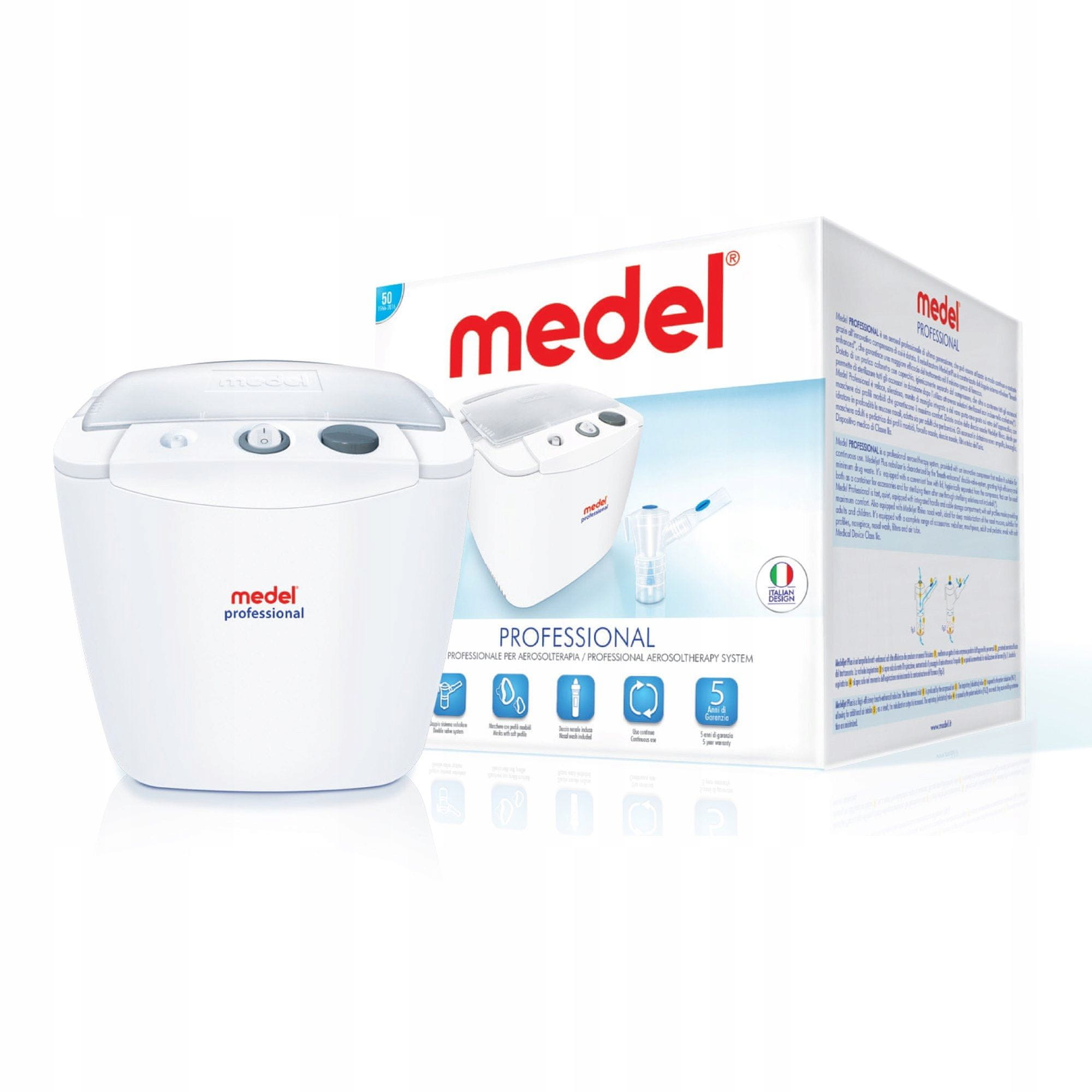 Profesionalni pnevmatski inhalator 1 kos. Profesionalni pnevmatsko-batni inhalator. Za bolnišnico in vso družino. Majhen, kompakten inhalator Medel Professional je brezkompromisna naprava, ki zagotavlja najvišjo terapevtsko učinkovitost. Opremljen je s sodobnim, vzdržljivim kompresorjem, zasnovanim za neprekinjeno delovanje. Namenjen je zdravstvenim ustanovam, bolnišnicam in pacientom, ki pogosto uporabljajo celovito aerosolno terapijo doma in želijo doseči najvišje rezultate. Nebulator Medel Jet Plus je eden najpomembnejših delov inhalatorja, majhna posoda, iz katere se zdravilo dozira. Medel Professional v svojem kompletu vključuje dva nebulatorja. Medel Jet Plus je tehnološko napreden nebulator, ki se aktivira z dihanjem in omogoča maksimalen izkoristek celotnega odmerka zdravila med vdihavanjem. Velikost delcev omogoča, da zdravilo doseže zgornja dihala, sapnik, bronhije, bronhiole in alveole. Medel Jet Rhino: Priporočljiv za uporabo pri vnetju sinusov, suhi nosni sluznici, čiščenju nosu odvečnih izločkov pri kroničnem rinitisu, okužbah zgornjih dihal ter alergijah na prah in cvetni prah. Zelo tiho delovanje kompresorja. Udobje pri vdihavanju, zlasti za paciente, ki se pogosto zdravijo z aerosoli, se poveča, ko je hrup naprave čim nižji; pri Medel Professional znaša le 52 dBA. Najmehkejše inhalacijske maske: Medel Soft Touch. Maske so pripomočki, ki so še posebej pomembni za paciente, ki pogosto vdihavajo. Nežna koža obraza je v neposrednem stiku z meglico zdravila, oblikovana maska Medel Soft Touch pa ima mehko, nežno konico, ki se prilagodljivo prilagodi obliki obraza in zmanjša morebitno draženje, ki se lahko pojavi okoli predelov, ki se zdravijo z zdravilom. Inhalator Medel Professional je opremljen z maskami Medel Soft Touch v dveh univerzalnih velikostih – za odrasle in starejše otroke ter za otroke od 6. meseca starosti. Profesionalno shranjevanje in higiena. Praktično ohišje inhalatorja Medel Professional ima integriran ročaj za nošenje, shranjevanje kabla in posebno posodo za dodatke. Ko je posoda odstranjena, jo lahko uporabite za sterilizacijo dodatkov zaradi majhnih lukenj, ki ustvarjajo sito. Suhe in očiščene dodatke je mogoče vstaviti nazaj v ohišje inhalatorja. Celotna enota je zasnovana na sodoben in funkcionalen način, kar zagotavlja udobje uporabnika med uporabo in po njej. V kompletu Medel Professional: Komplet inhalatorjev Medel Professional vključuje: nebulator Medel Jet Plus, ustnik, masko Medel Soft Touch za otroke, masko Medel Soft Touch za odrasle, ustnik, zračno cev, nadomestne zračne filtre, dodatke in posodo za sterilizacijo. Nebulator Medel Jet Rhino, nosne konice, nosni sprej in navodila v poljščini. Specifikacije: Znamka: MEDEL Količina v paketu: 1 kos. Parametri s certifikatom TÜV: TAKMMAD v skladu z novim standardom EN13544–1: 0,8 μmRespiratorna frakcija 92,6 %Povprečni čas nebulizacije 2 ml zdravila: 0,3 ml/minNačin delovanja: neprekinjenRaven hrupa: 52 dBHitrost nebulizacije/dovajanja: 0,3 ml/minZmogljivost kompresorja: 5,1 ml/minDelovni tlak iz nebulatorja: 5,1 ml/minNajvišji tlak (bar): 2,2 barNajmanjši volumen danega zdravila: 2 mlNajvišji volumen danega zdravila: 8 mlBarva: belaTeža naprave: 2,2 kgDimenzije: 21 cm x 22 cm x 24 cmNapajanje: OmrežnoMedicinski pripomoček – ima oznako CE št.: 0123Ima izjavo EU o skladnostiVključuje uporabniški priročnik in vmesnik v poljščiniVključuje nalepko v poljščini