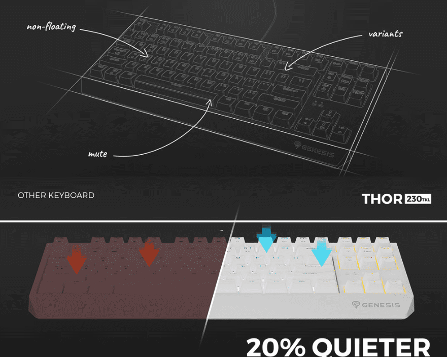 Glasno delovanje tipkovnice je težava, s katero se sooča veliko igralcev. Vemo, kako pomembno je to lahko ne le za vas, ampak tudi za člane vašega gospodinjstva. Zato smo Genesis Thor 230 TKL opremili z dodatno peno, nameščeno med tiskanim vezjem in ploščo tipkovnice. Ta absorbira vibracije, ki jih povzročajo močni pritiski tipk, s čimer zmanjša glasnost tipkovnice za 20 %, in to še ni vse. Preslednica je prav tako dobila dodatno utišanje. Naš sistem za dušenje hrupa zagotavlja mirno igranje tudi med ostrimi dvoboji.
