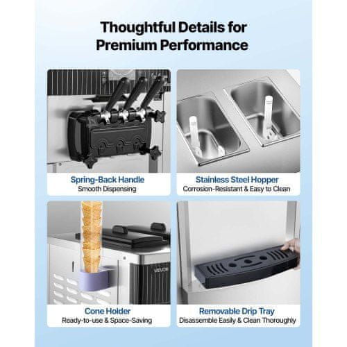 Ta komercialna stroj za sladoled je zasnovan za okolja z visoko povpraševanjem kot so slaščičarne kavarne in bari z napitki ter omogoča učinkovito in neprekinjeno proizvodnjo mehke postrežbe sladoleda. S sistemom predhlajenja in mešanjem v lijaku zagotavlja svežo gladko in enotno teksturo sladoleda tudi v času največje obremenitve ali pri nočnem shranjevanju. Uporabniku prijazen LED zaslon in trpežna konstrukcija iz nerjavečega jekla ga naredita zanesljivo in enostavno za vzdrževanje izbiro za postrežbo različnih okusov.