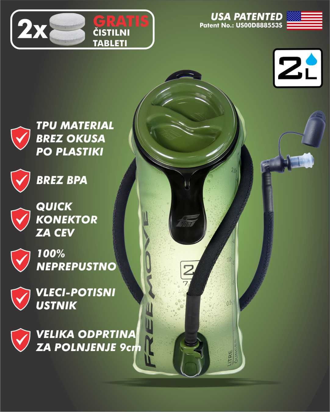 FREEMOVE 2L hidracijski meh za vodo - zelen, termo izolirana cev s priključkom quick-connect, velika polnilna odprtina, ergonomski ročaj, brez vonja BPA, premium TPU material, mehek ustnik, 2 čistilni tableti