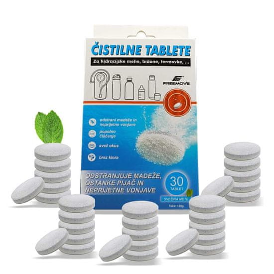 FREEMOVE Čistilne tablete 30-kos za čiščenje hidracijskih mehov za vodo, bidon, termovk, ostalih steklenic za pijačo ter espresso kavnih aparatov... Učinkovito, enostavno in okolju prijazno