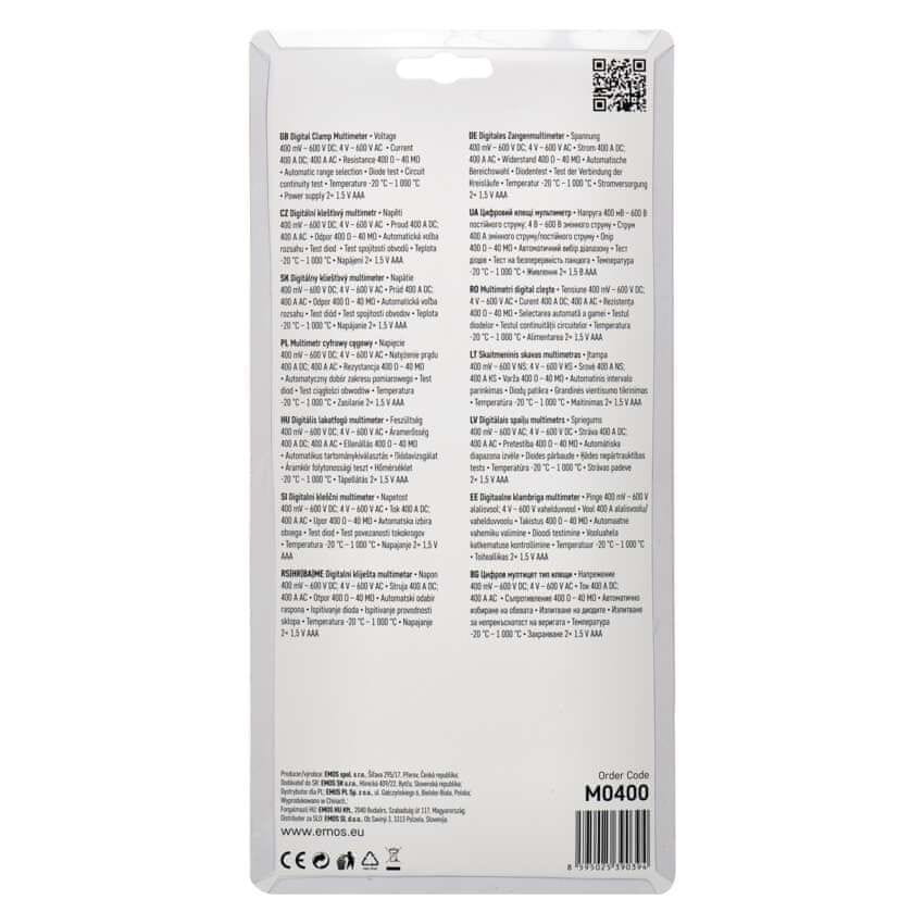 AC napetost: 4–600 V • DC napetost: 400 mV – 600 V • kleščni multimeter • izbira območja: avtomatska • električni upor: 400 Ohm – 40 MOhm • povezanost vezja • test diod • zaznam namerjene vrednosti • avtomatski vklop • prikaz šibke baterije • priloženo: baterije, navodila, merilne konice Celoten opis