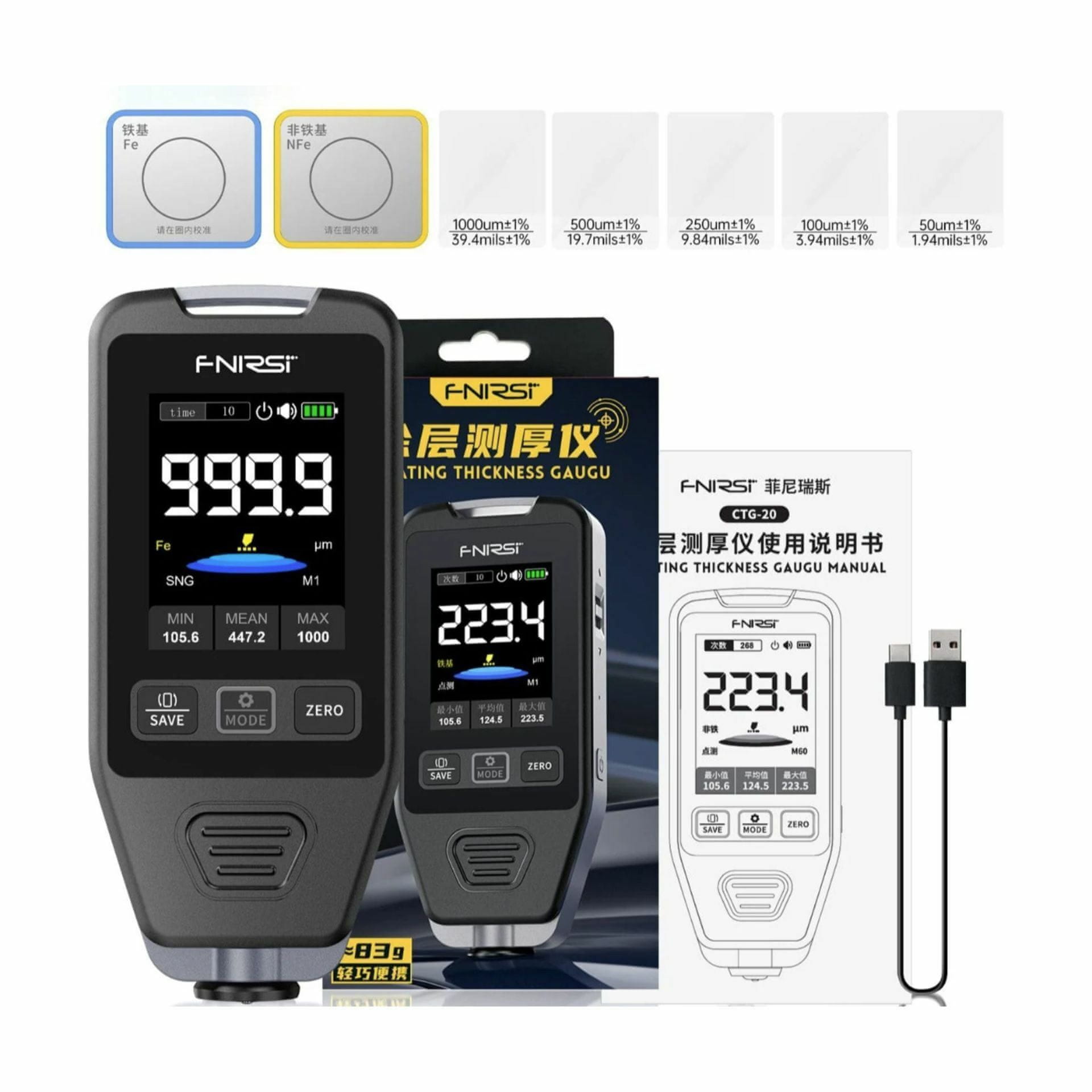 Paket vsebuje: 1× Merilec debeline laka/barve FNIRSI CTG-20, 1× Polnilni kabel, 1× Navodila