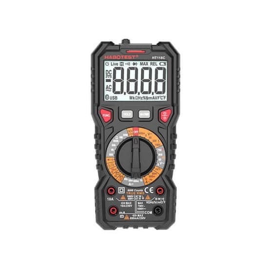 Univerzalni merilnik Habotest HT118C Multimeter Habotest je nepogrešljivo orodje, ki omogoča natančno merjenje parametrov, kot so napetost, kontinuiteta ali temperatura. Osvetljen zaslon olajša uporabo. Vgrajena svetilka vam bo omogočila tudi delo v temnih prostorih, zahvaljujoč posebnemu stojalu pa lahko napravo stabilno postavite na ravno površino. Izdelek je opremljen tudi s senzorji NCV za brezkontaktno merjenje napetosti. Merilnik podpira ročno izbiro območja.