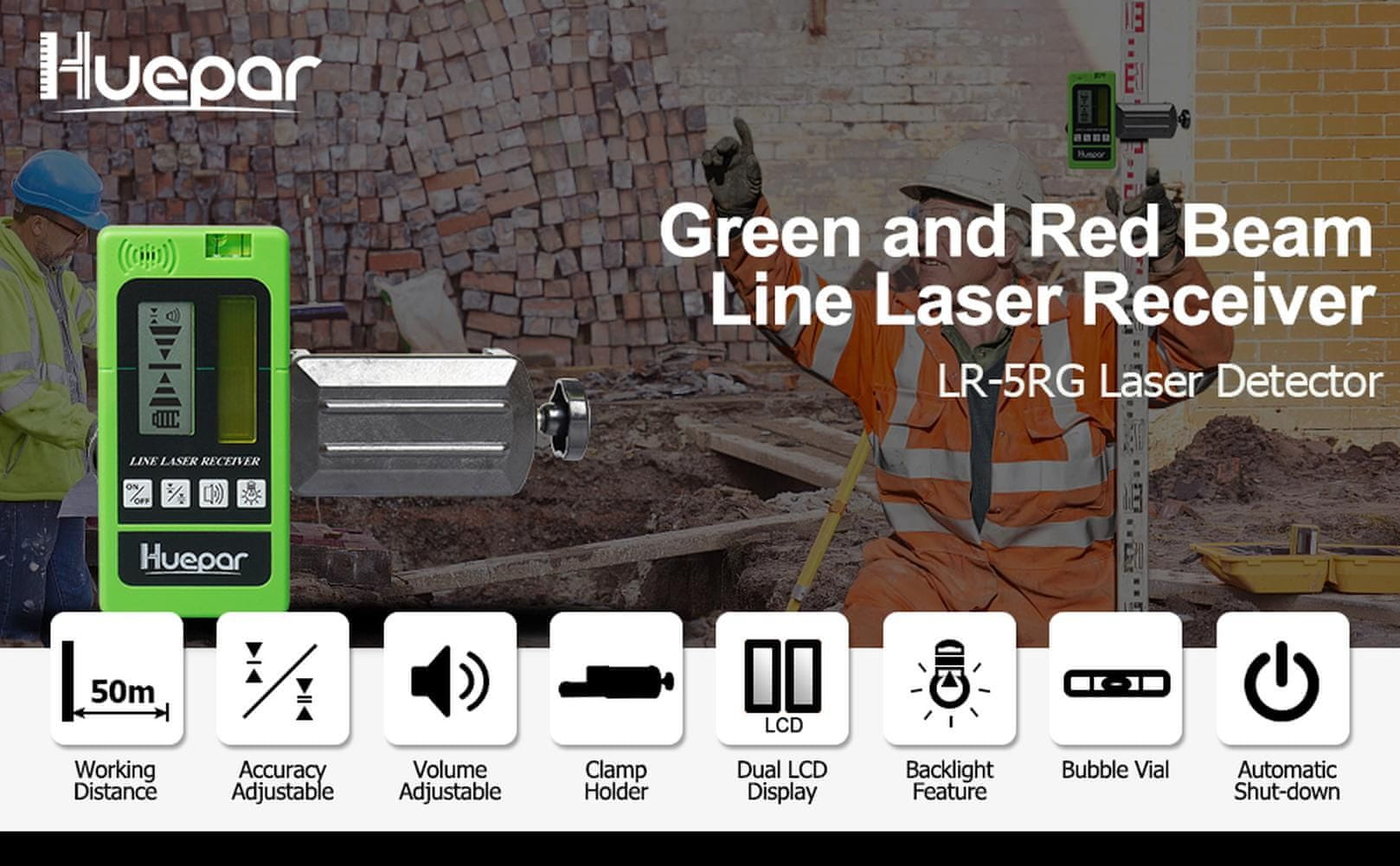 - NA VOLJO ZA RDEČI IN ZELENI IMPULZNI LASER – POTREBNO je VKLOPITI pulzni način laserskega nibela, ko uporabljate laserski sprejemnik Huepar LR-5RG Laserski detektor/sprejemnik nivoja omogoča zaznavanje rdečih in zelenih impulznih laserskih žarkov v težkih svetlobnih pogojih , razdalje do 200 čevljev.