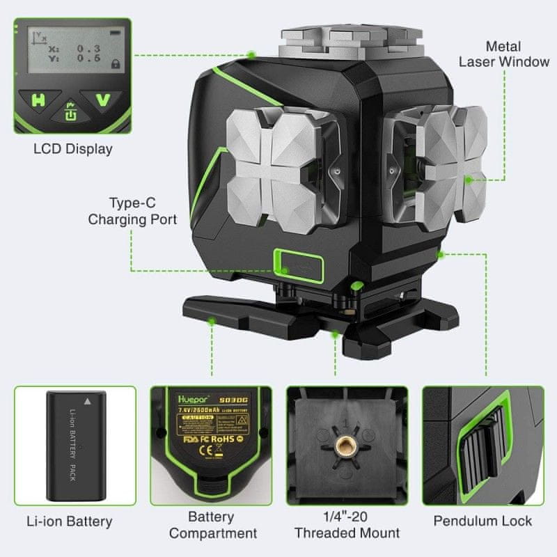 DELOVNI PROSTOR 25m, 50–60m z laserskim detektorjem Huepar LR-6RG/LR-5RG
