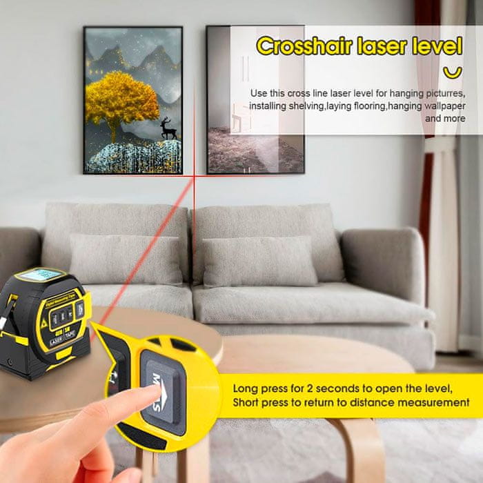 2 merilca v 1 izdelku – klasični meter, ki izmeri dolžino do 5 metrov in laserski merilnik, ki izmeri razdaljo do 40 metrov!
