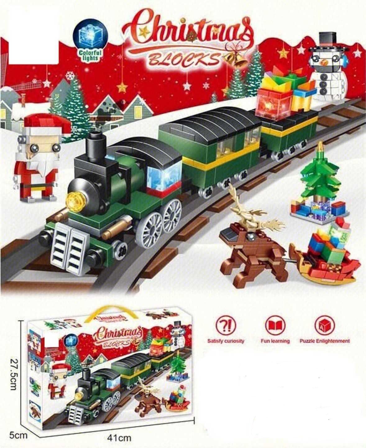 Barvit komplet kock z vlakom in vagoni, polnimi daril, ki ga spremljajo praznični okraski, kot so Božiček, snežak, božično drevo in severni jelen. Popolno božično darilo za otroke in ljubitelje gradnikov.
