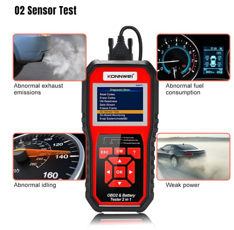 Diagnostični merilnik, optični bralnik OBD2, tester akumulatorja Konnwei KW870