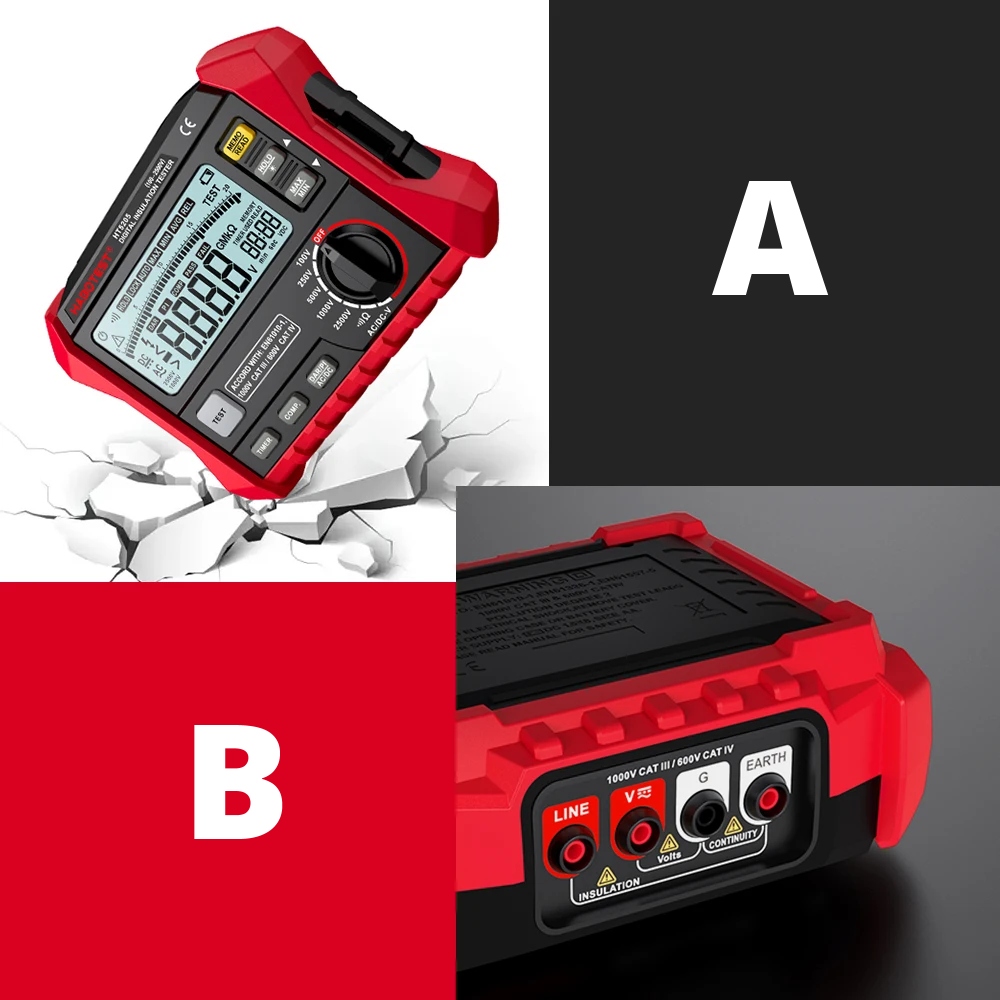 Merilo je opremljeno s tesno prilegajočim se zaščitnim ohišjem z utori in učinkovitim gumijastim materialom za blaženje udarcev, kizagotavlja zaščito opreme za preprečevanje poškodb in zagotavljanje varnejših meritev. Silikonska prevleka je odlično odporna na vročino in mraz.