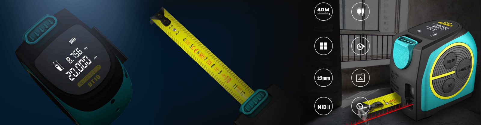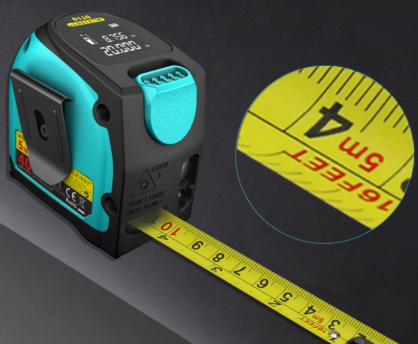Laserski merilnik razdalje MILESEEY DT10B3 z merilnim trakom je zanesljivo merilno orodje za določanje razdalj. Odlikujejo ga izjemna natančnost, hitra odzivnost in velik domet (40 m) ter multifunkcionalnost zaradi dodatnega 5 m dolgega traku.