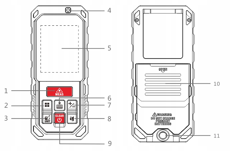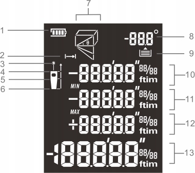 - Gumb za nastavitev referenčne točke in enote: možnost merjenja iz spredaj, zadaj in za namestitev. Za enote lahko izbirate med: metri, čevlji, čevlji + palci.