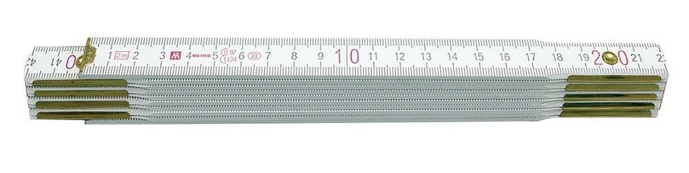 Klasični zložljivi leseni meter iz bukovega lesa, pobarvan belo, zaščiten pred vlago in UV-sevanjem, priključki merilnih elementov ojačani z medeninastimi priključki.