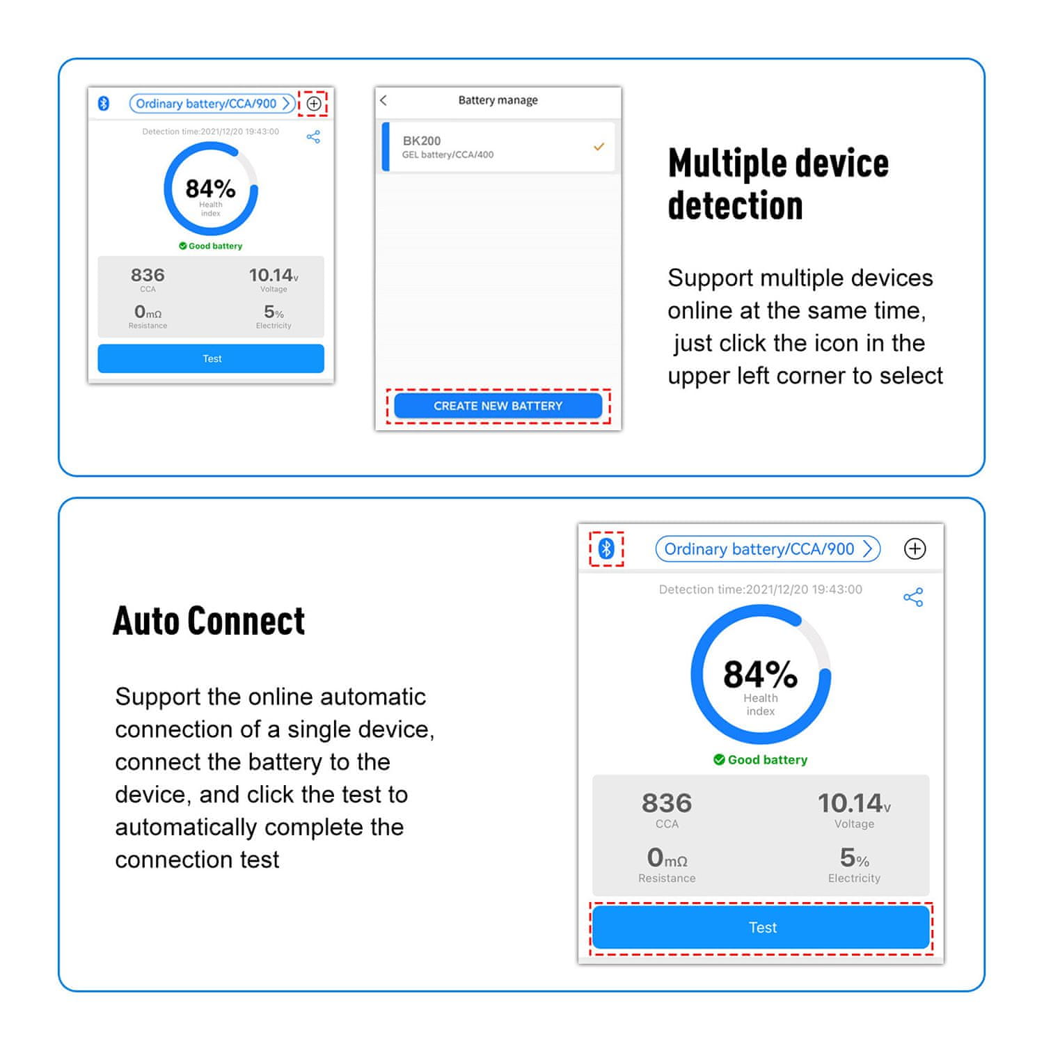 Merilnik akumulatorja Konnwei BK200 je napredna naprava, ki omogoča natančno merjenje in testiranje akumulatorjev vozil. S širokim razponom napetosti (6–12 V) in preskusnimi načini, vključno s standardnim preizkusom, preskusom zagona in preskusom polnjenja, zagotavlja celovito diagnozo zdravja baterije. Poleg tega je uporaba tega merilnika zaradi LED indikatorja in zmožnosti odčitavanja meritev prek namenske aplikacije intuitivna in priročna. Aplikacija je združljiva z iOS (8 ali novejšim) in Androidom (5.0 ali novejšim), kar omogoča spremljanje rezultatov meritev prek pametnega telefona. Varna povezava je zagotovljena z zaščito pred napačno povezavo. Merilnik ima široko merilno območje CCA (100–2000) in je idealno orodje za profesionalce in avtomobilske navdušence.