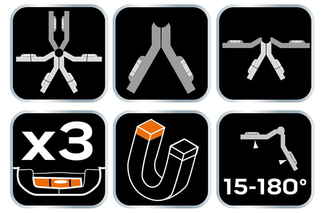 Premična vodna tehtnica 71–003 znamke NEO ima 4 magnete in 3 viale. Omogoča merjenje vrtnih stebrov. Izdelan je iz trpežne plastike in ima delovno dolžino 209 mm. Njegovo območje delovanja je 15 – 180°. Vodna tehtnica znamke NEO je premična, zaradi česar se enostavno zloži in se ne poškoduje hitro. Priporočljivo za domače mojstre in profesionalce.