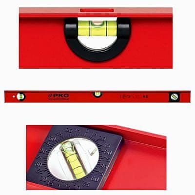 Vattenpasset har en H-profil i aluminium. Utrustad med horisontella och lodräta libellor. Den har också en gradskiva med justerbar vinkel.