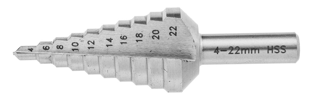 GRAFITNI stopenjski sveder (ref. št. 57H739) s premeri od 4 do 22 mm, izdelan iz hitroreznega jekla. Omogoča vrtanje in povrtavanje lukenj v tanke pločevine iz jekla, aluminija, bakra in plastičnih elementov. 2 mm delitev in označevanje vsakega koraka svedra vam omogočata, da natančno izberete premer svedra, ki ustreza vašim potrebam.