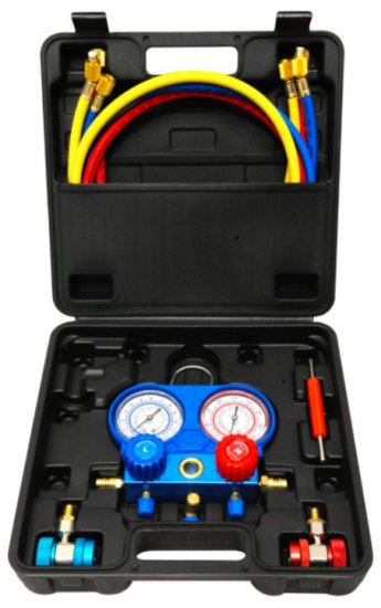 • Profesionalni komplet manometrov za avtomobilske in stacionarne klimatske naprave s hladilnim sredstvom R134A, s kompletom treh barvnih cevi dolžine 150 cm in hitrimi priključki za avtomobilsko klimatsko napravo.