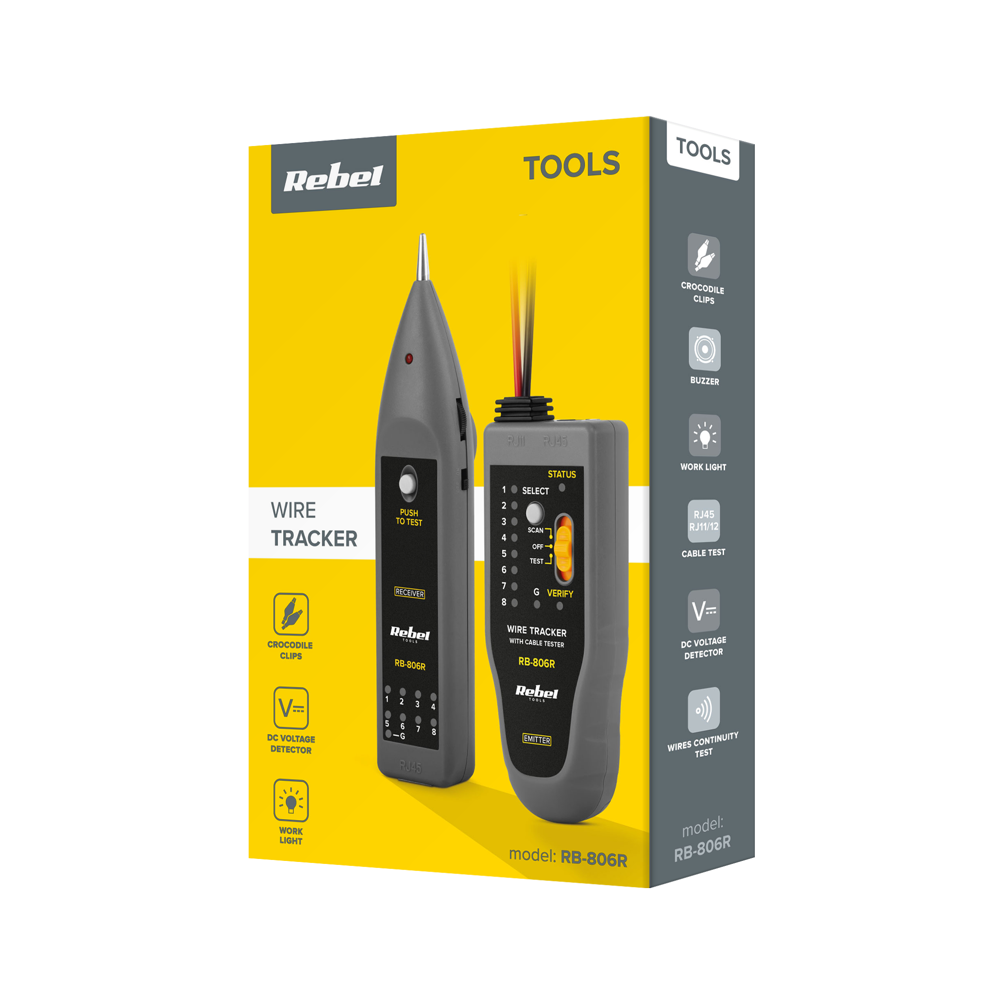 Tester telefonske linije REBEL RB-806R je vsestransko orodje, ki je primerno za profesionalno in domačo uporabo. Aplikacije. Zahvaljujoč naprednim funkcijam omogoča natančno lociranje žice, testiranje telefonskih in omrežnih kablov ter preverjanje neprekinjenosti žice, zaradi česar je nepogrešljivo orodje za telekomunikacijske tehnike in električarje.