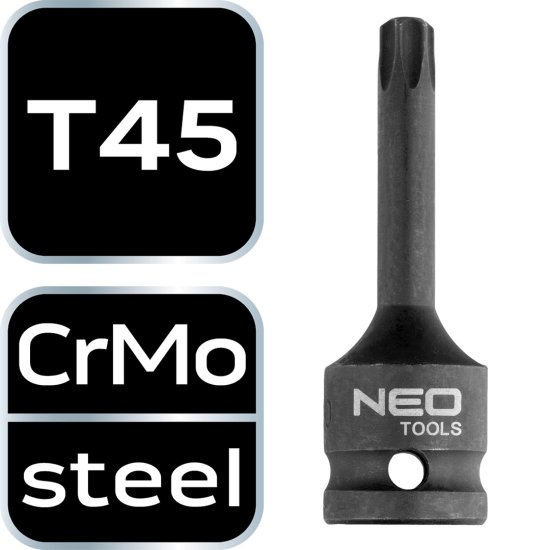 Udarni nastavek T45 10–260 proizvajalca NEO je zasnovan za orodja z udarnim mehanizmom. Izdelano iz krom-molibdenovega jekla – odporno na korozijo, raztezanje in visoke temperature. Pokrovček zagotavlja zaščito pred neželenim zdrsom zatiča iz vtičnice. Na voljo je v velikosti T45. Blagovna znamka NEO izpolnjuje zahteve profesionalcev.