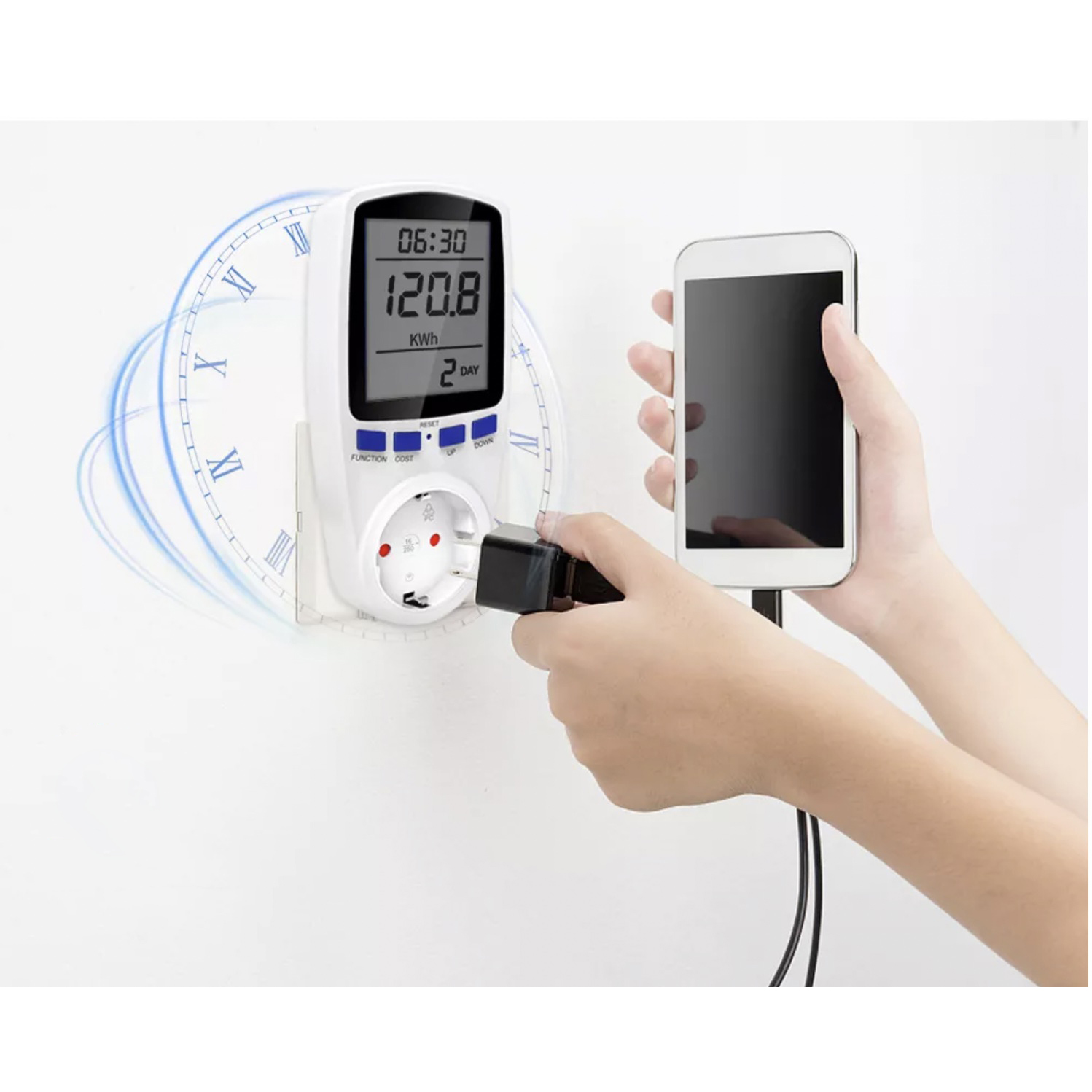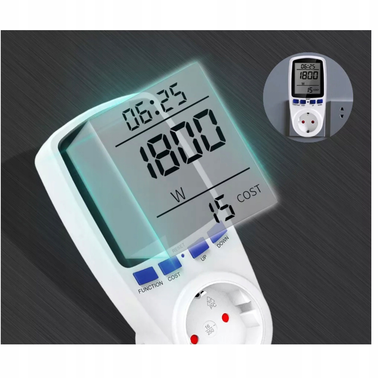 Vatmeter je enostaven za uporabo – preprosto ga priključite v električno vtičnico in priključite napravo na njen priključek. Komplet je izjemno priročen, saj ga lahko preprosto premikate iz ene vtičnice v drugo, da preverite porabo energije v različnih delih vašega doma. Odlikuje ga svetel in lahko berljiv zaslon, ki prikazuje trenutne vrednosti moči, napetosti in porabe energije.
