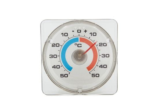 Okenski termometer s prozorno skalo za zunanjo uporabo, primeren za namestitev na okenski okvir.