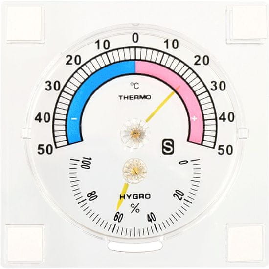Kvadratni prozorni termometer z higrometrom s pritrditvijo nalepke. Namenjen za lepljenje na zunanjo stran okna, na akvarij, terarij itd. dimenzije 90 × 90 mm, globina 18 mm, higrometer meri od 0 do 100 %, temperaturno območje –50 do +50 °C. Češki proizvajalec. EAN 8594025310951