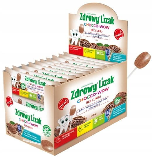 Zdrave lizike Mniam-Mniam Chocco-Wow 40 kosov Okus čokolade Prehransko dopolnilo Osnovna sestavina zdravih lizik Mniam-Mniam je finski ksilitol, ki ima učinke proti kariesu. Lastnosti Zaradi vsebnosti finskega ksilitola ima učinke proti kariesu. 2 lizici pokrivata dnevno potrebo po vitaminih D in K. Pomaga ohranjati zdrave zobe in kosti. Krepi imunski sistem. Je nizkokalorična – le 15 kcal. Navodila za uporabo Priporočen dnevni odmerek, potreben za doseganje koristnega učinka izdelka: 1–2 lizici na dan. Ne prekoračite priporočenega odmerka, tj. 2 lizici na dan. Sestavine Sladilo: ksilitol; sredstvo za povečanje prostornine: izomalt; kakav (10 %); naravna aroma čokolade; sredstva proti sprijemanju: magnezijeve soli maščobnih kislin, gumi arabika; menakinon (vitamin K); holekalciferol (vitamin D). Aktivne sestavine: OKUS KAKAV: ksilitol, naravni kakav (10 %); naravna aroma čokolade; menakinon (vitamin K) 11,25 μg (30 % RDA*); holekalciferol (vitamin D) 2,5 μg (50 % RDA*). Neto teža: 40 kosov. Prehranskih dopolnil se ne sme uporabljati kot nadomestilo za raznoliko prehrano ali zdrav način življenja. Ne prekoračite priporočenega dnevnega odmerka. Prehranska dopolnila shranjujte izven dosega majhnih otrok. Pred uporabo izdelka priporočamo, da preberete podrobne informacije na embalaži ali priloženi navodili. Pogoji shranjevanja: Hranite v tesno zaprti posodi. Na suhem in hladnem mestu, izven dosega otrok. Zaščitite pred svetlobo. Proizvajalec: Starpharma Sp. z o.o., Jedności 905–506 Lesznowola