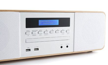 Mikro sistem les/bele barve z Bluetoothom in induktivnim polnjenjem, FM radio z RDS predvaja CD-R/RW/MP3, moč 50 W, izenačevalnik, USB vhod za predvajanje in USB vrata za polnjenje, daljinski upravljalnik, napajanje iz omrežja 230 V.