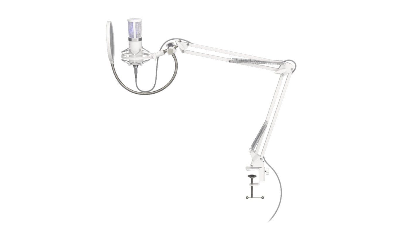 Dolga nastavljiva roka prihrani prostor na mizi ter omogoča hitro in enostavno nastavitev mikrofona v želeni položaj. Zasnova omogoča, da jo pritrdite na stranico mizne plošče in tako prihranite prostor za druge pomembne predmete. Zahvaljujoč sistemu vključi in igraj je v trenutku pripravljen in lahko začnete govoriti ter uporabljati mikrofon v polni meri. Poleg tega elegantna zasnova v beli barvi oniksa daje vašemu domačemu studiu pridih ekskluzivnosti.