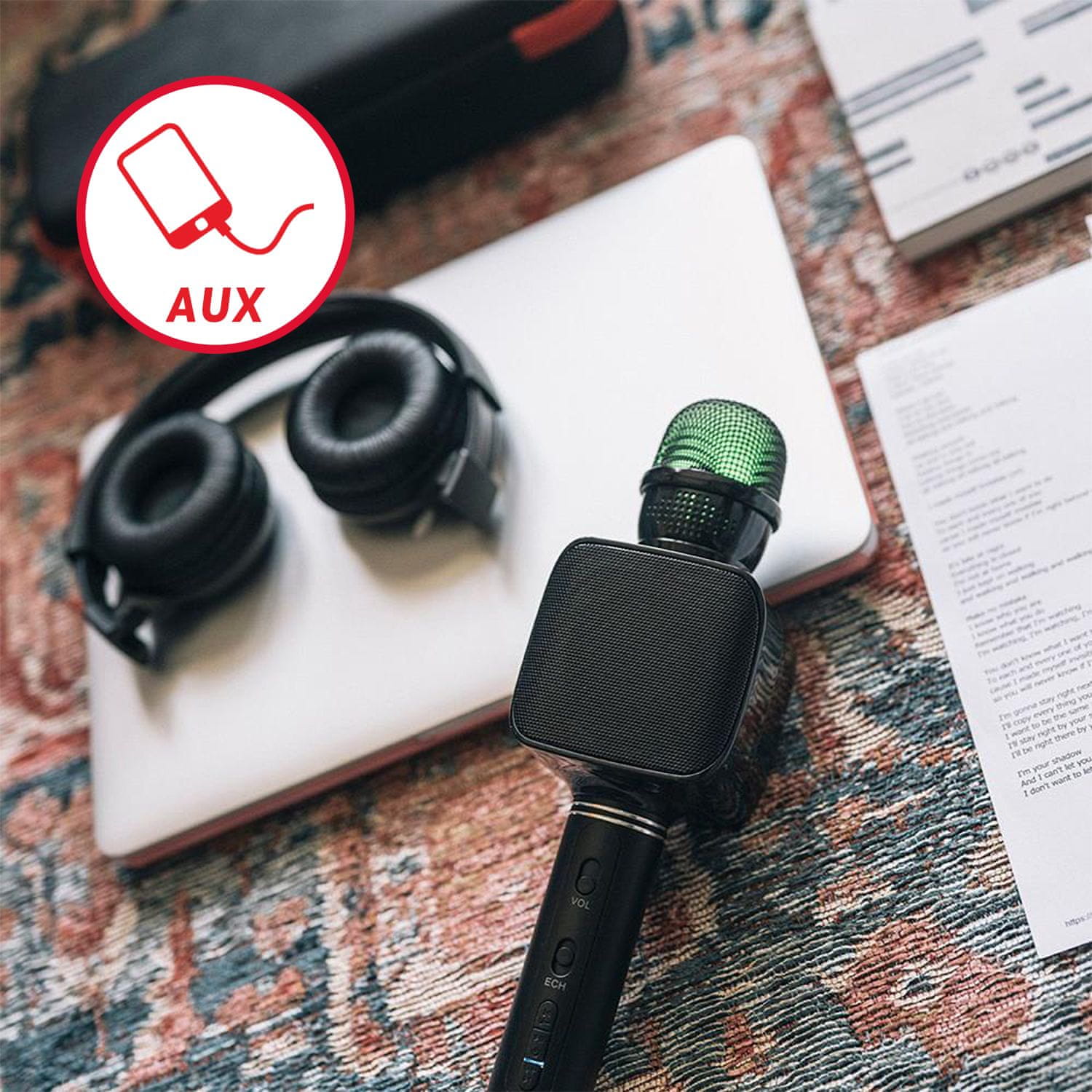 Na multifunkcijskem mikrofonu, z vgrajenim zvočnikom z močjo 3 W, lahko poslušate vašo najljubšo glasbo tako, da priključite USB ključek, vstavite micro SD kartico, neposredno preko pomožnega kabla AUX ali se povežite s pametnim telefonom, tablico preko brezžične povezave Bluetooth. Vse kar morate še storiti je, da vključite funkcijo mikrofona in avdio KARAOKE pustolovščina se lahko prične takoj!