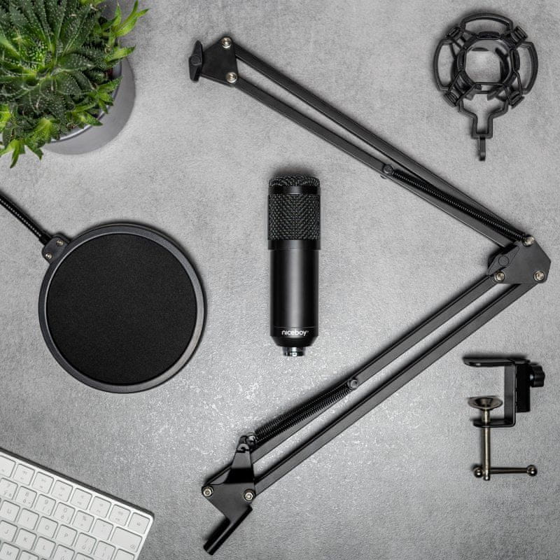 Na prilagodljivem gosjem vratu lahko mikrofon prilagodite tako, da se med govorjenjem počutite udobno. Mikrofonu je priloženo prilagodljivo stojalo z največjo dolžino do 77 cm. Z nastavljivo objemko ga lahko pritrdite tudi na mizo z debelino plošče do 45 mm. Oblazinjen nosilec zagotavlja, da lahko mikrofon Niceboy stabilno namestite. Vibracije ali udarci ne motijo prenosa zvoka. Poleg tega Pop filter in vetrovni pokrov zmanjšujeta količino zvočnih udarcev na mikrofon, ki se pojavijo pri izgovarjanju določenih glasov.